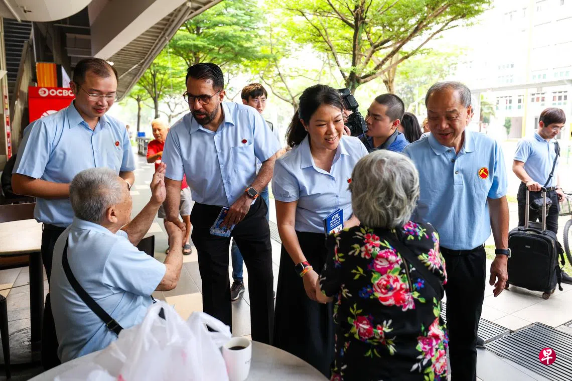 毕丹星在星期四陪同工人党盛港集选区团队在Kopitiam Square拜访选民。工人党主席林瑞莲,前党魁刘程强和后港区前议员方荣发也前去助选。