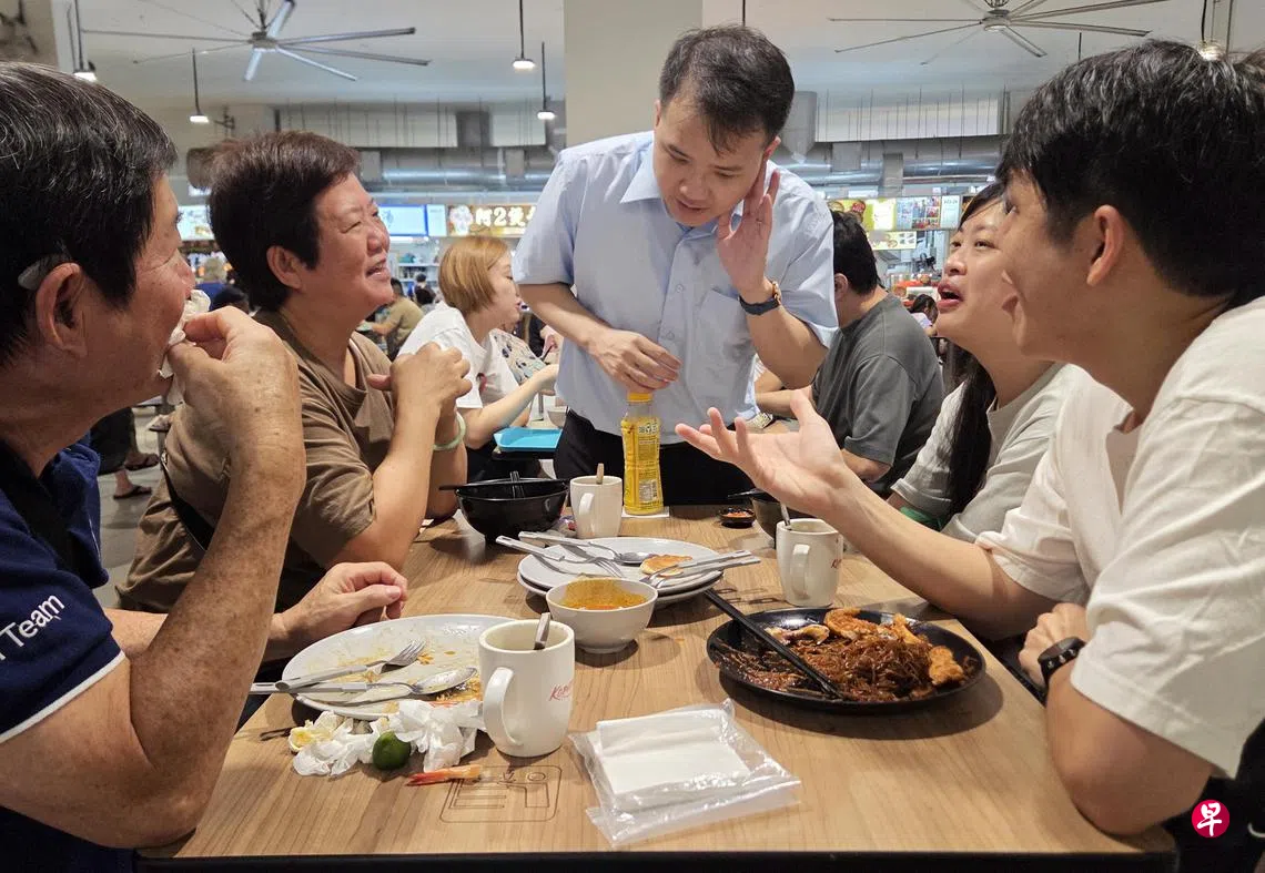 代表工人党出征惹兰加由区的新人刘宇扬(中),星期六早上在芬维尔民众俱乐部的熟食中心与食客交流,了解他们所关心的课题。惹兰加由是本届大选新划分的单议席选区,刘宇扬的竞选对手是人民行动党的黄志明。 (郑一鸣摄)