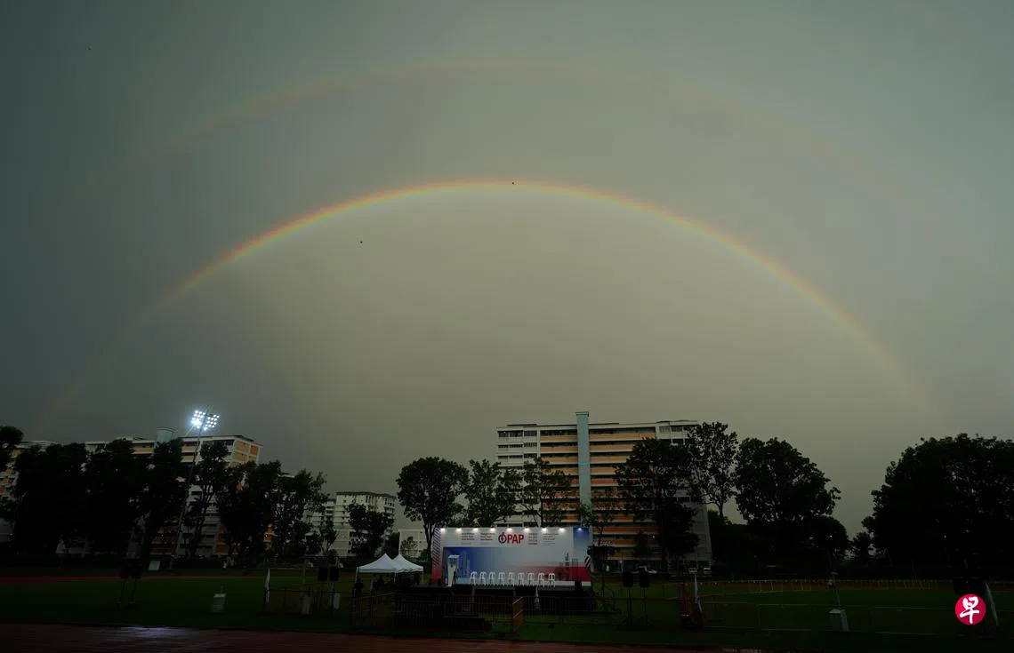 人民行动党4月29日在义顺体育场举行群众大会。夜幕降临前,天空出现双彩虹。 (谢智扬摄)