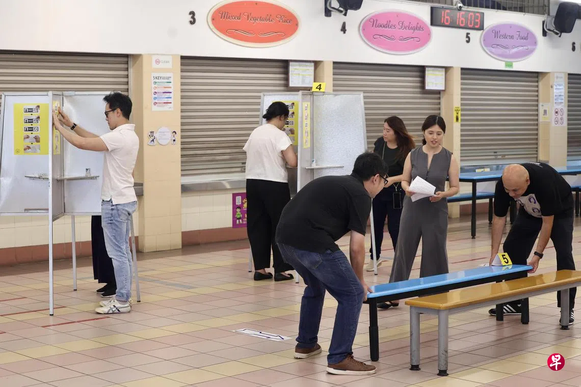 2025年全国大选冷静日这一天,选务人员为隔天的投票日做最后准备。摆放桌椅、张贴告示,在地面设标记引导选民排队等等,大家一丝不苟,忙碌而有序地照顾好每个小细节,齐心协力确保投票顺利进行。