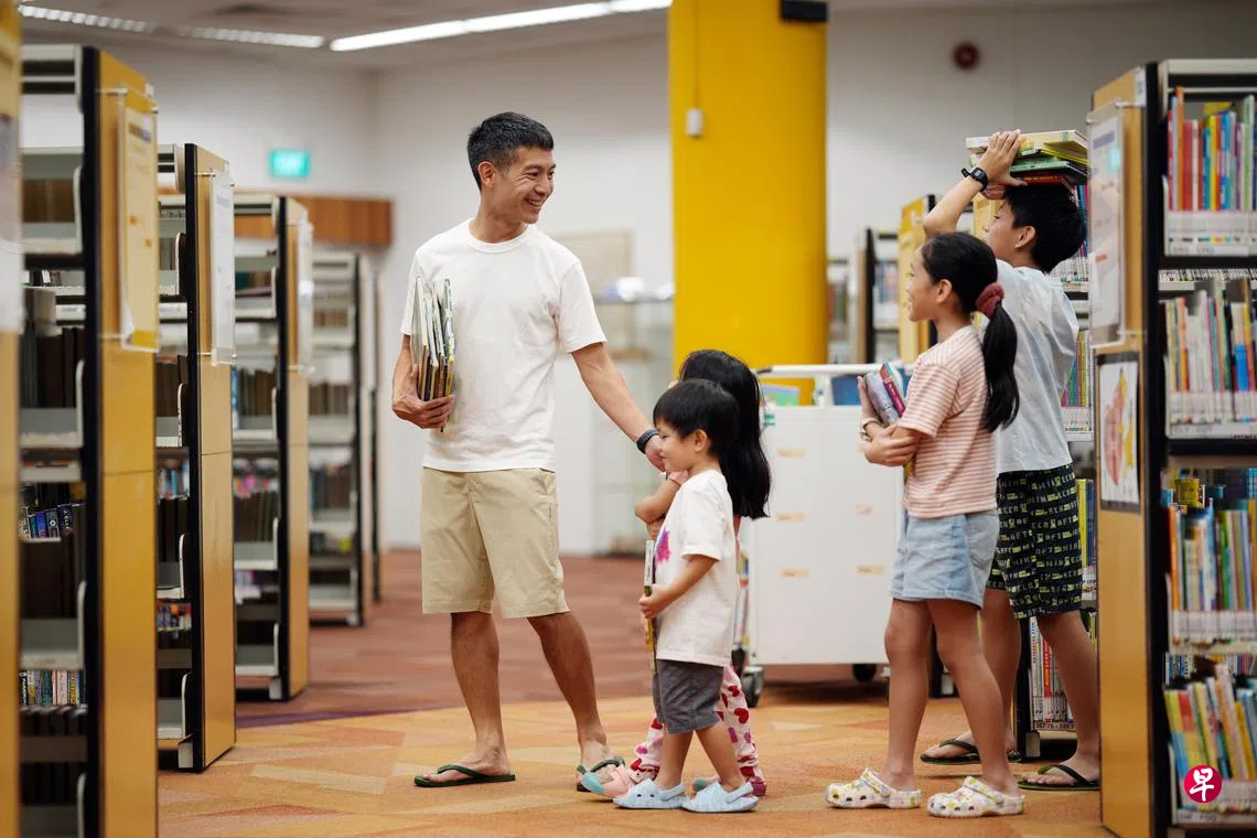 人民行动党惹兰勿刹集选区候选人罗守恩(Shawn Loh,38岁)是四个孩子的爸爸,他在冷静日带着孩子们前往芽笼东图书馆借阅书籍。