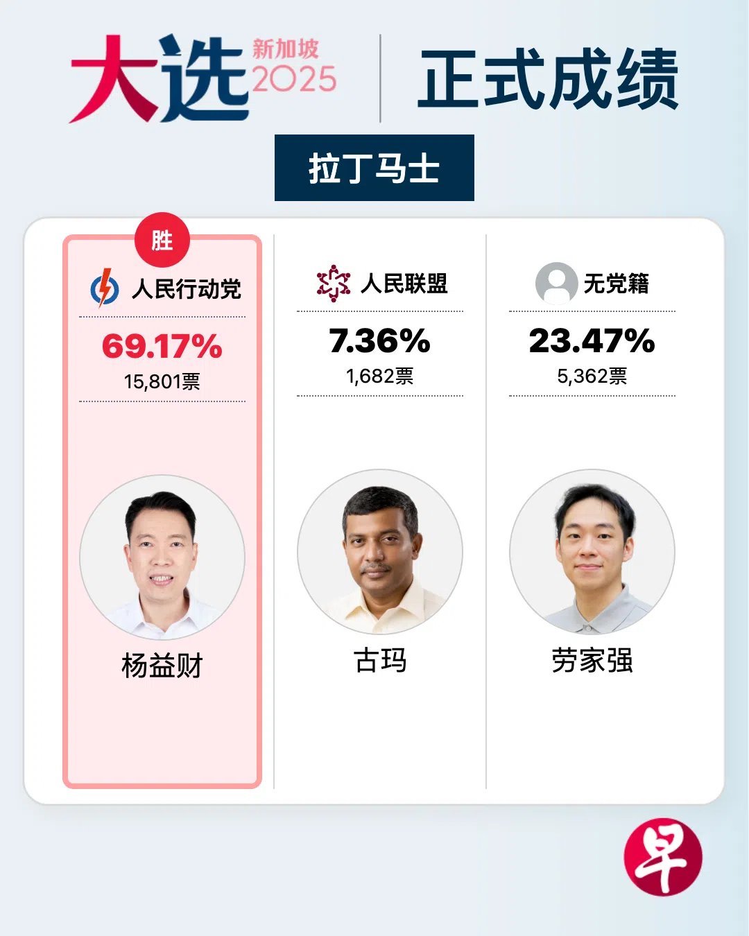 本届大选,尽管人民行动党成功守住了拉丁马士单选区,但得票率相比往年有所下滑。无党籍参选人在三角战中得票排在第二位,虽败犹荣。