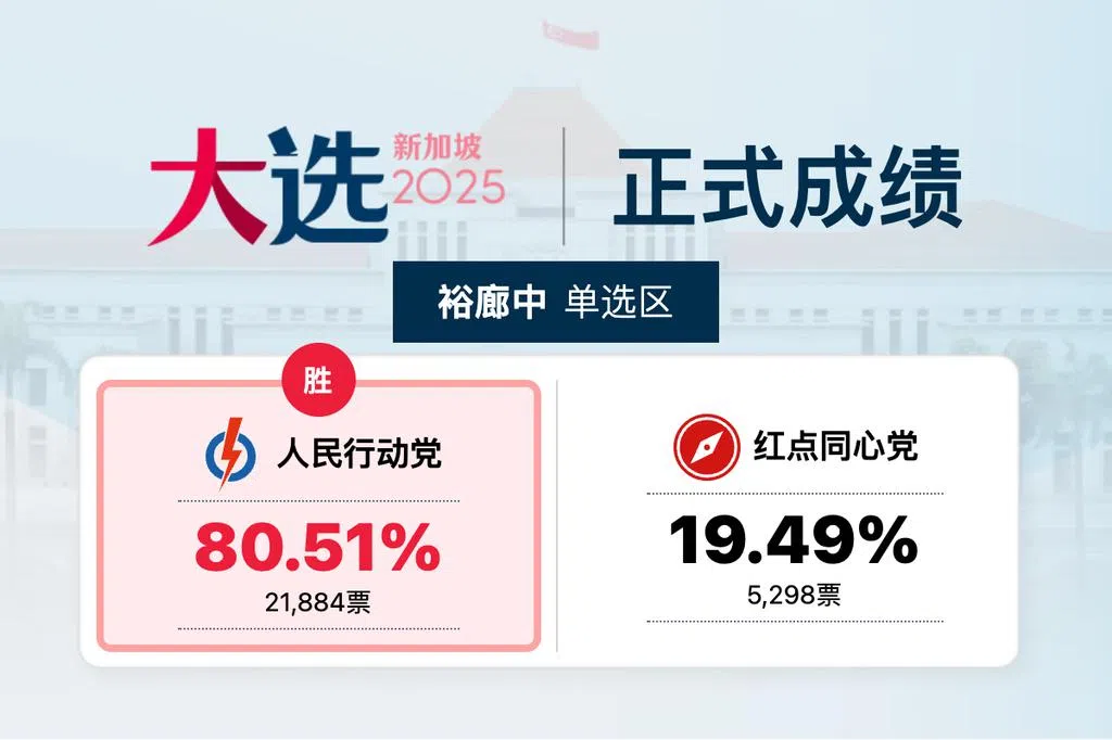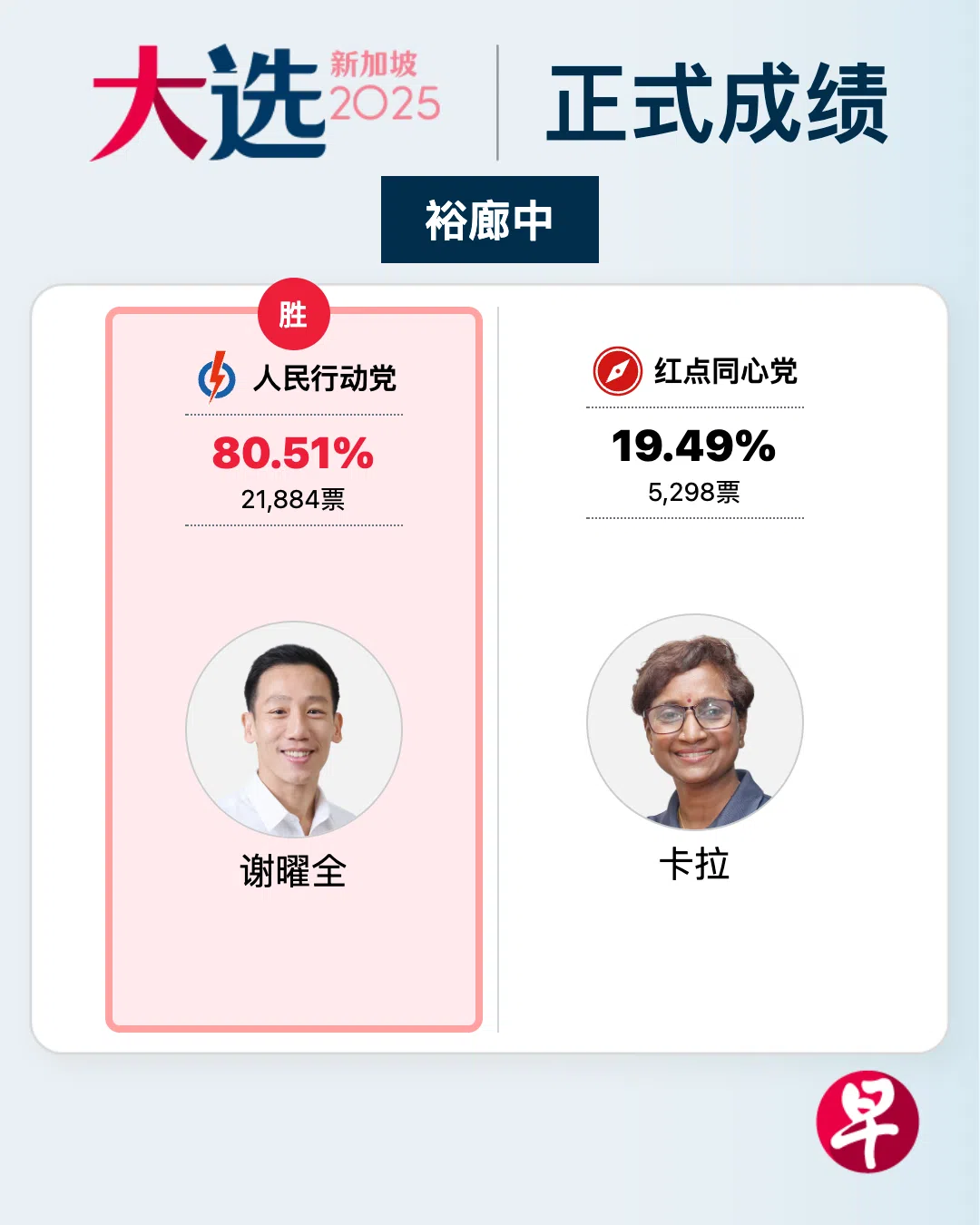 人民行动党顺利守住新划分出来的裕廊中区,首次独挑大梁的谢曜全以80.51%得票率,击败红点同心党临阵换将的卡拉。