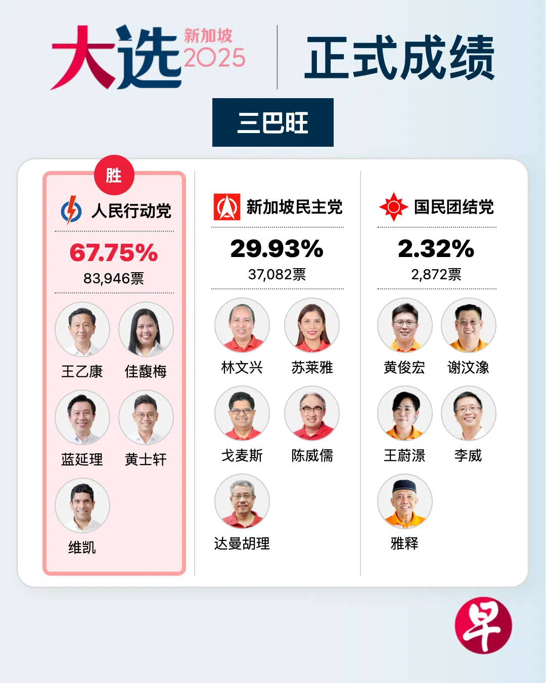 由卫生部长王乙康领军的人民行动党三巴旺集选区团队在三角战中胜出,以67.75%的得票率,击败新加坡民主党(29.93%)和国民团结党(2.32%),守住这个自1988年成立以来,皆由执政党夺下的集选区。团结党因得票率未达12.5%,按柜金被没收。