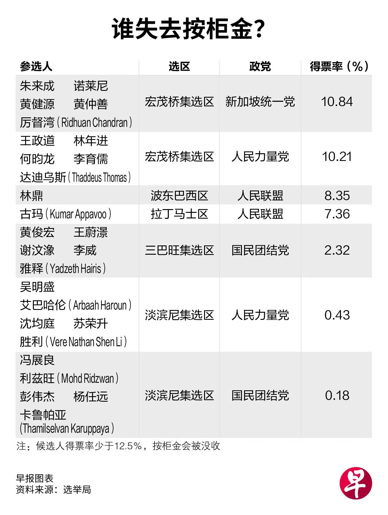 失去按柜金的参选人包括:竞逐波东巴西区的人民联盟参选人林鼎;出征拉丁马士区的人民联盟参选人古玛(Kumar Appavoo);同时角逐宏茂桥集选区五人议席的人民力量党和新加坡统一党团队;双双出战淡滨尼集选区五人议席的人民力量党和国民团结党团队;以及参选三巴旺集选区五人议席的国民团结党团队。