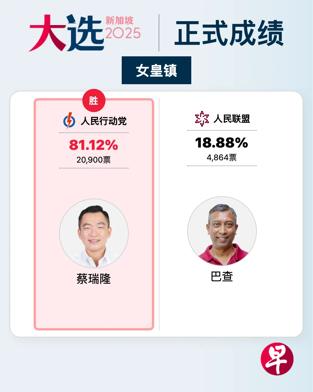 人民行动党在女皇镇单选区高票获胜,首次独挑大梁的蔡瑞隆成为本届大选的“票王”。丹戎巴葛集选区则是得票率最高的集选区。