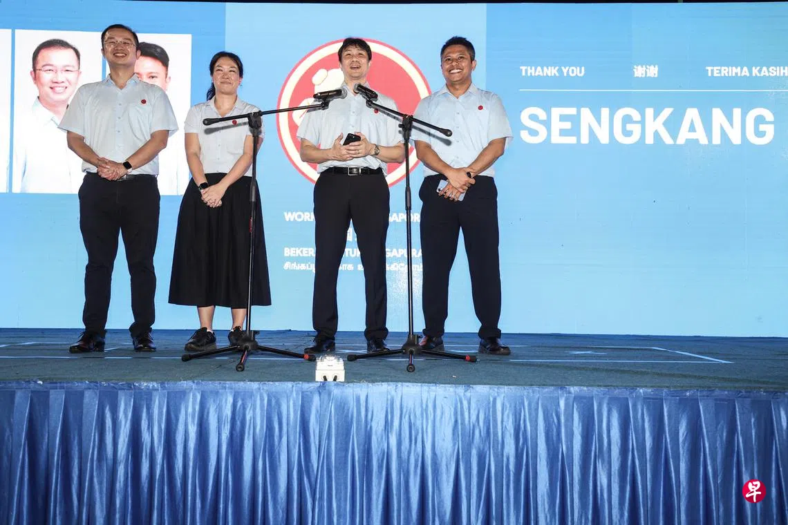 盛港集选区正式成绩于星期天(5月4日)凌晨1时30分公布后,该四人团队于实龙岗体育场的工人党集会地点,在支持者的欢呼声中上台致辞。