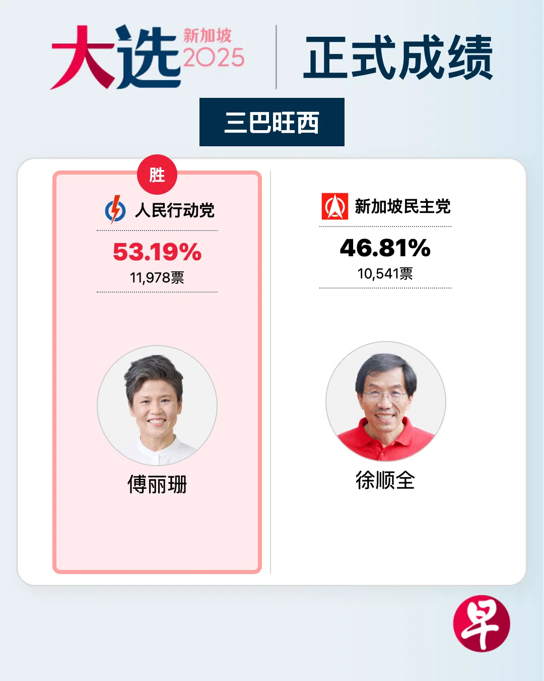 人民行动党的傅丽珊,以53.19%得票率,击败新加坡民主党的徐顺全(46.81%),当选三巴旺西区议员。这个成绩比一些傅丽珊支持者的预期来得低。