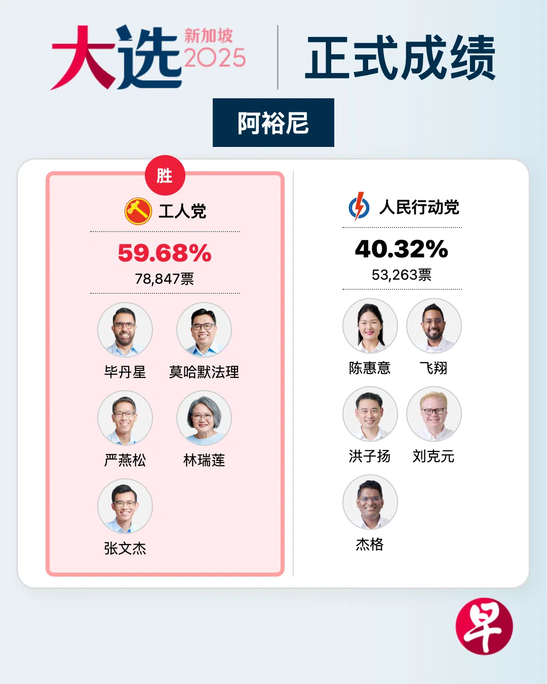 工人党秘书长毕丹星率领的竞选团队在阿裕尼集选区,以59.68%对40.32%击败人民行动党团队,成功捍卫这个集选区。