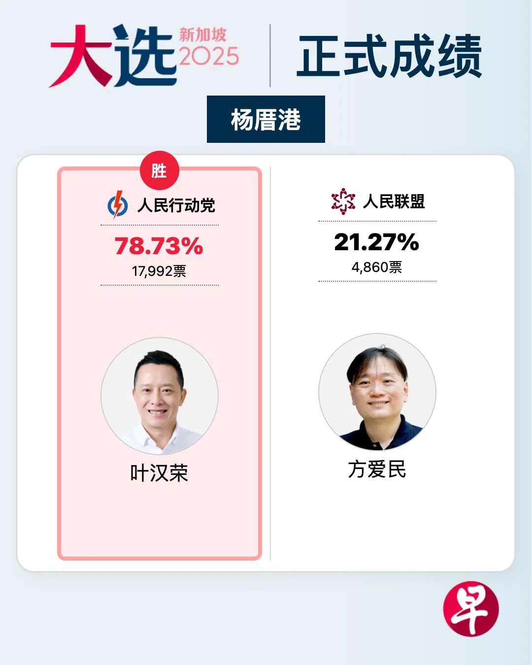 47岁的叶汉荣胜选后接受媒体访问说:“(杨厝港)居民对我们有很大的信心,我很开心,接下来五年会更加努力地帮助他们,提升选区,并在国会上为他们发声。”