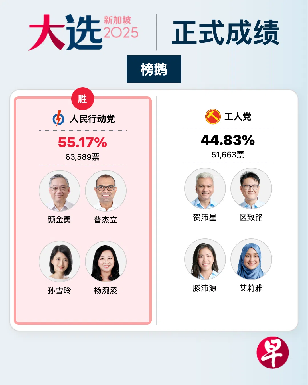 选举官韩国元星期天(5月4日)接近凌晨1时宣布榜鹅集选区的投票成绩,行动党获得6万3589张选票,工人党得票5万1663张,废票822张。经历整晚焦灼等待后终于尘埃落定,行动党位于勿洛体育场的集合中心,顿时响起热烈的欢呼掌声。