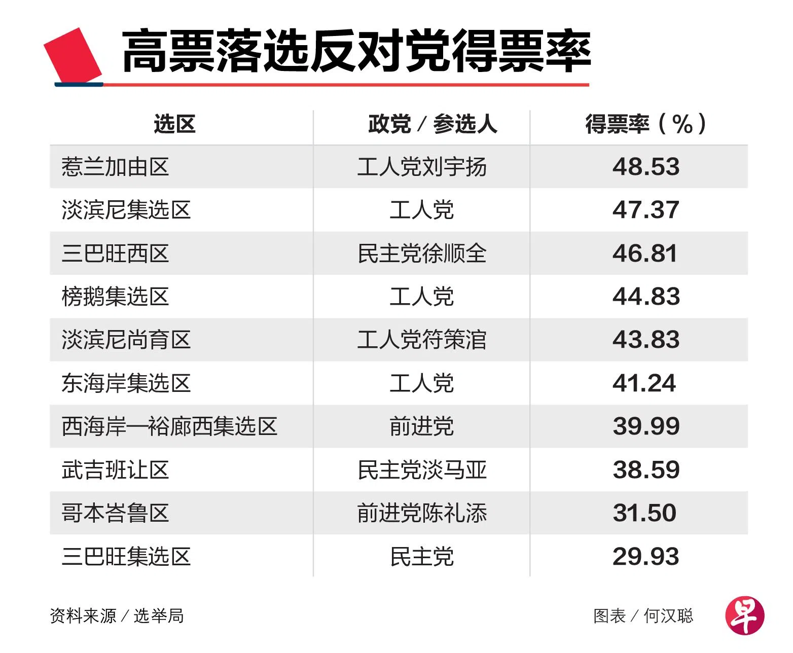 本届大选,工人党惹兰加由区参选人刘宇扬,以及工人党淡滨尼集选区团队分别取得48.53%和47.37%得票率,是落败反对党参选人中最高的两个。