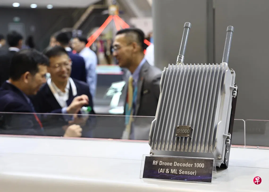 新科工程展区工作人员向《联合早报》记者介绍,新版的RF Drone Decoder 1000射频无人机解码器,可借助新科工程自主专利的人工智能技术来识别无人机的波形(waveforms),以便及时发现可能存有威胁的无人机类型。顾名思义,它的有效侦测半径为一公里。