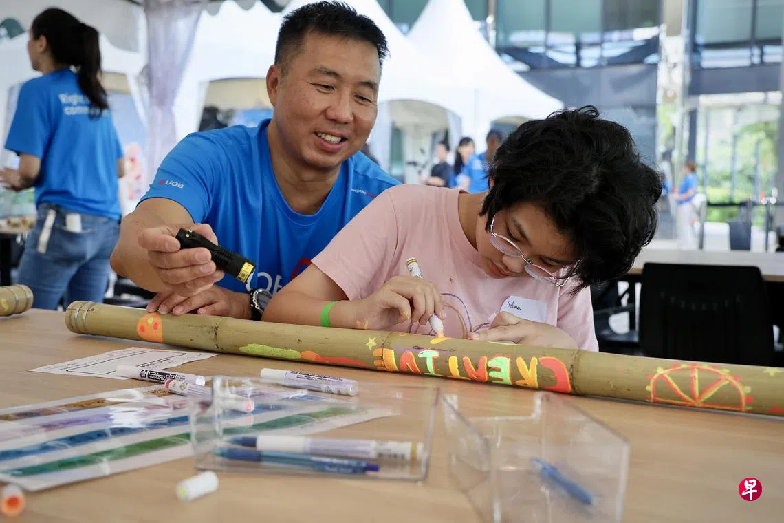 大华银行星期六(5月10日)也在风华南岸(South Beach Tower)的公共空间,举办为期两天的工作坊,让参与孩童在竹子上作画,到场的就包括吴恩慧与约60名来自新加坡读写障碍协会的孩童。