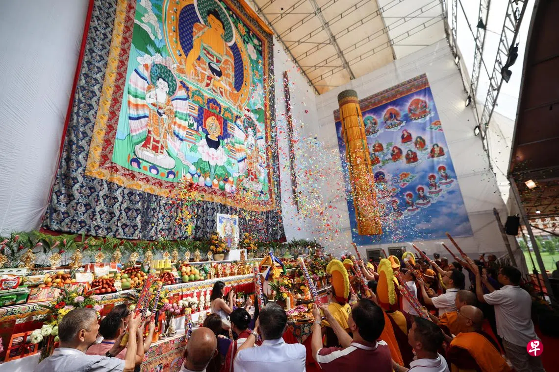 大乘禅寺传播与活动经理黄伟锋受访时说,今年是继2017年后,大乘禅寺再次完整悬挂起这幅高度超过四层楼的巨型唐卡。“我们特别设计搭建了很高的台架,把整幅画像挂起来,确保卷帘布可以顺利升起,给信众带来更好的体验。”