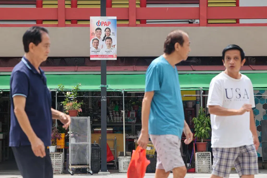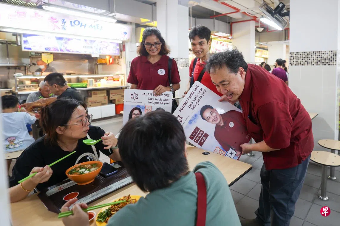 本届大选尘埃落定,但星期天(5月11日)中午的牛车水珍珠百货商场,几名身着暗红色制服者,向正在向用餐的食客推介竞选海报。