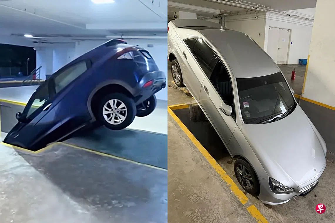 大楼停车场的指示不清楚,设计也被指有视觉误区,导致车主以为自己开下“小斜坡”驶往底层,岂料却掉进底层的装卸停车位“倒栽”,两辆车先后遭殃。