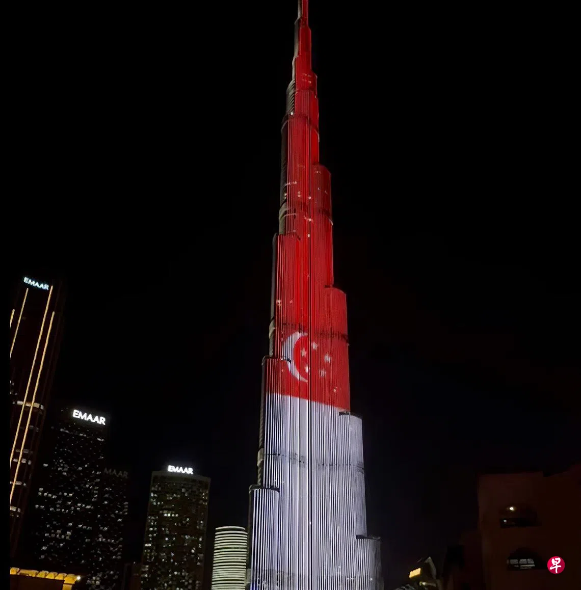 为庆祝新加坡与阿拉伯联合酋长国建交40周年,迪拜的世界最高建筑哈利法塔(Burj Khalifa)星期四(5月15日)晚亮起新加坡国旗。我国外交部长维文医生隔天在脸书分享相关视频,楼高828米的塔身,在夜空下闪耀着红白色的新加坡国旗,相当壮观。