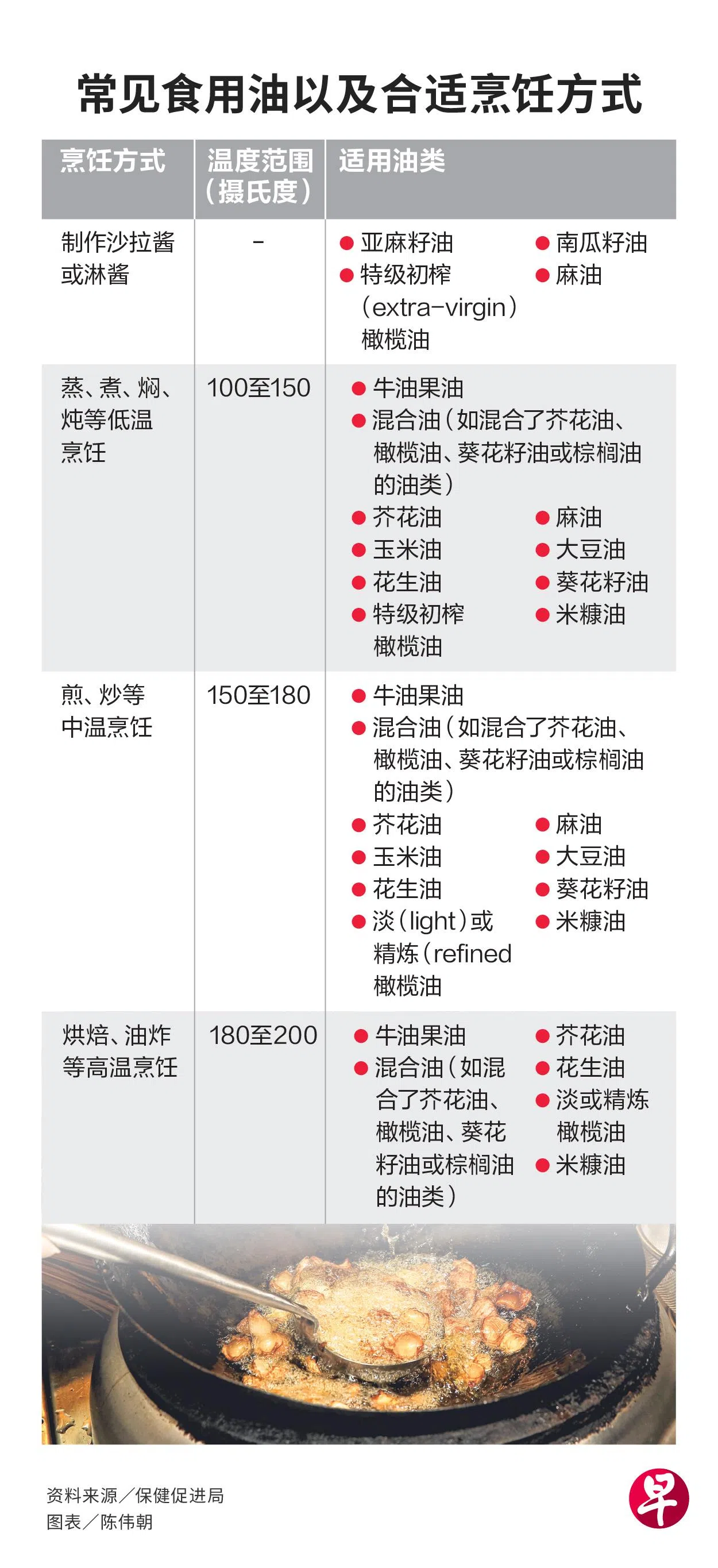 当局也提醒消费者,要适当使用较健康油类,除了要考虑营养成分,还要顾及油的冒烟点。一般而言,冒烟点高的油更适合高温烹饪,冒烟点低的油则较适合低温烹饪。