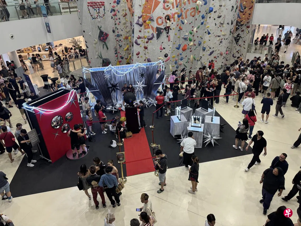 《新明日报》记者星期天下午走访嘉龙威购物广场时,首先映入眼帘的是商场大厅特地从5月16日至25日为歌迷设置的特别布景,让他们打卡拍照。