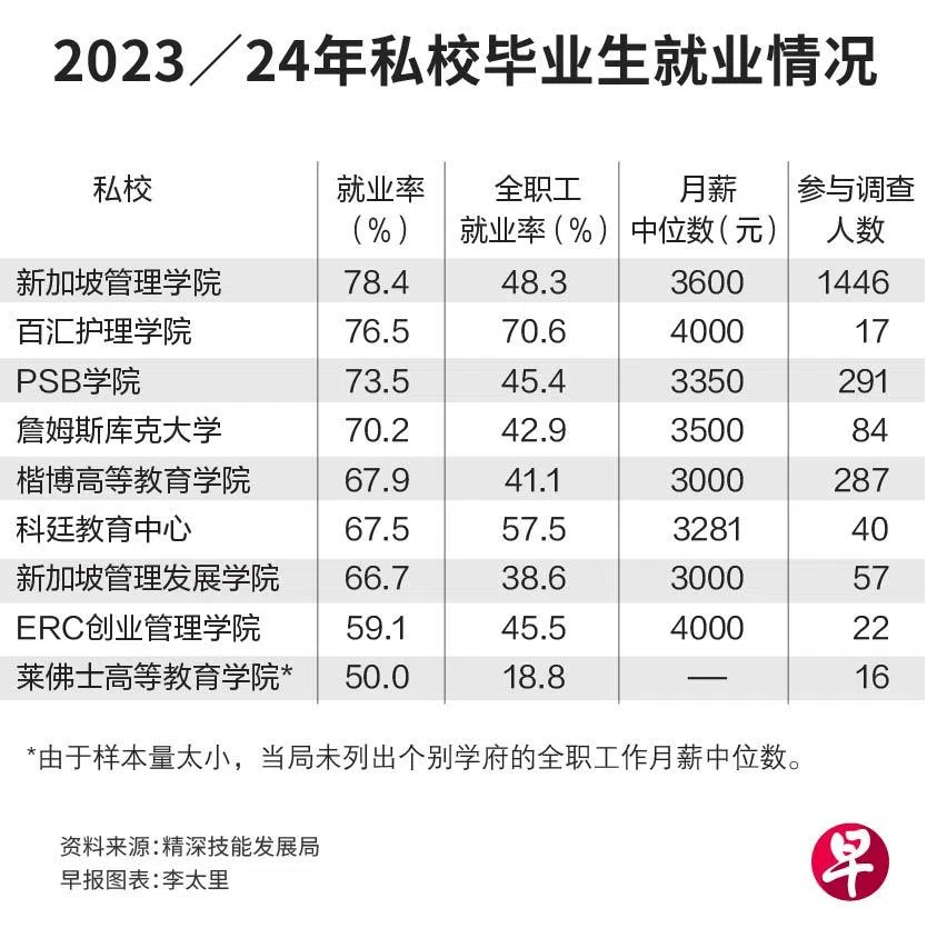 私校学生的整体就业率相比前一届的83.2%有所下降,全职就业率也低于前一届的58.7%。