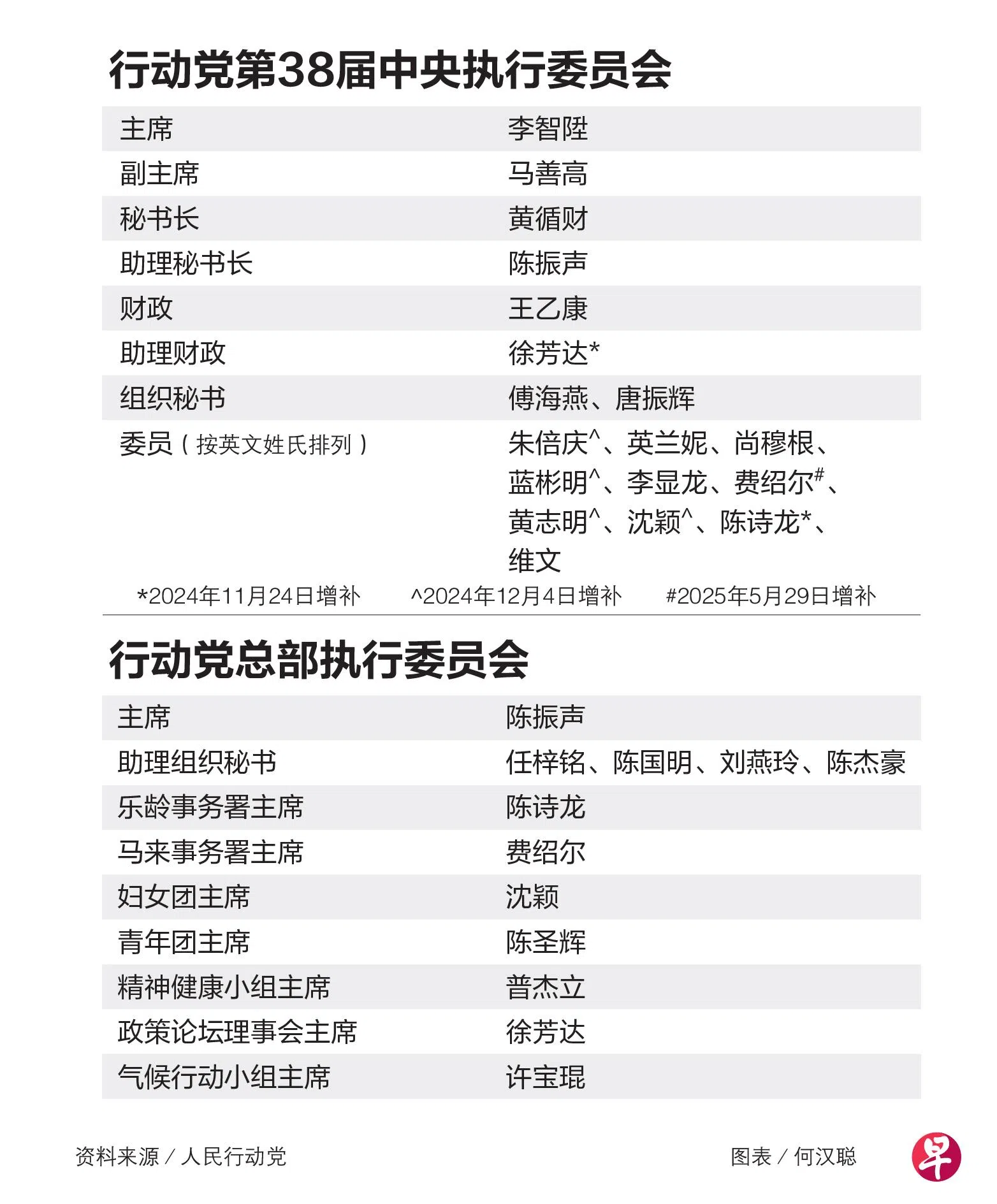 行动党去年11月24日在干部大会上举行党选,数千名干部党员通过秘密投票,选出第38届中委会成员,国家发展部长徐芳达和人力部长兼贸工部主管能源与科技的陈诗龙医生,当时通过增补进入中委会。