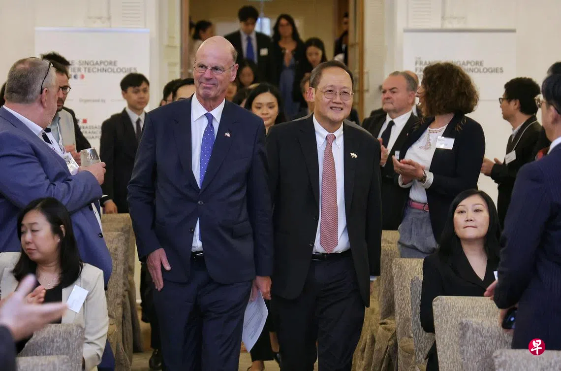 主管能源与科技的人力部长陈诗龙医生星期五在富丽敦酒店出席法国—新加坡前沿科技论坛时,与法国经济、财政及工业和数码主权部长隆巴尔(Eric Lombard)见证颁发有条件许可证与签署备忘录仪式。