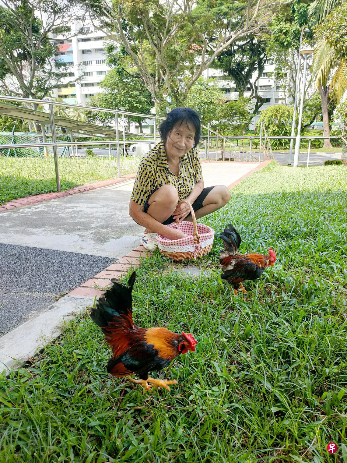 在武吉班让法嘉路组屋楼下,83岁的阿嫲梁莲英正在遛“鸡”,用福建话呼唤着“爱儿”回家。