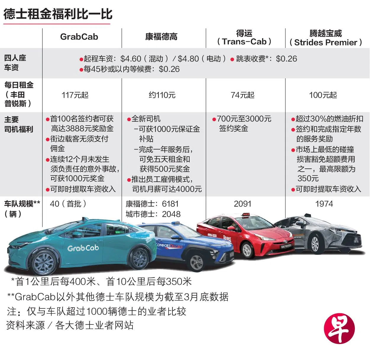 本地市面上目前有另五家德士品牌,即同属一个集团的康福和城市德士,还有得运、腾越宝威及百胜。这些业者都提供丰田普锐斯混动德士,日租最低的相信是得运,从74元起跳。