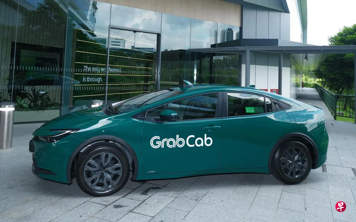 新德士的宝石绿车身上印着白色“GrabCab”字样,车型为混合动力的丰田普锐斯(Toyota Prius)。
