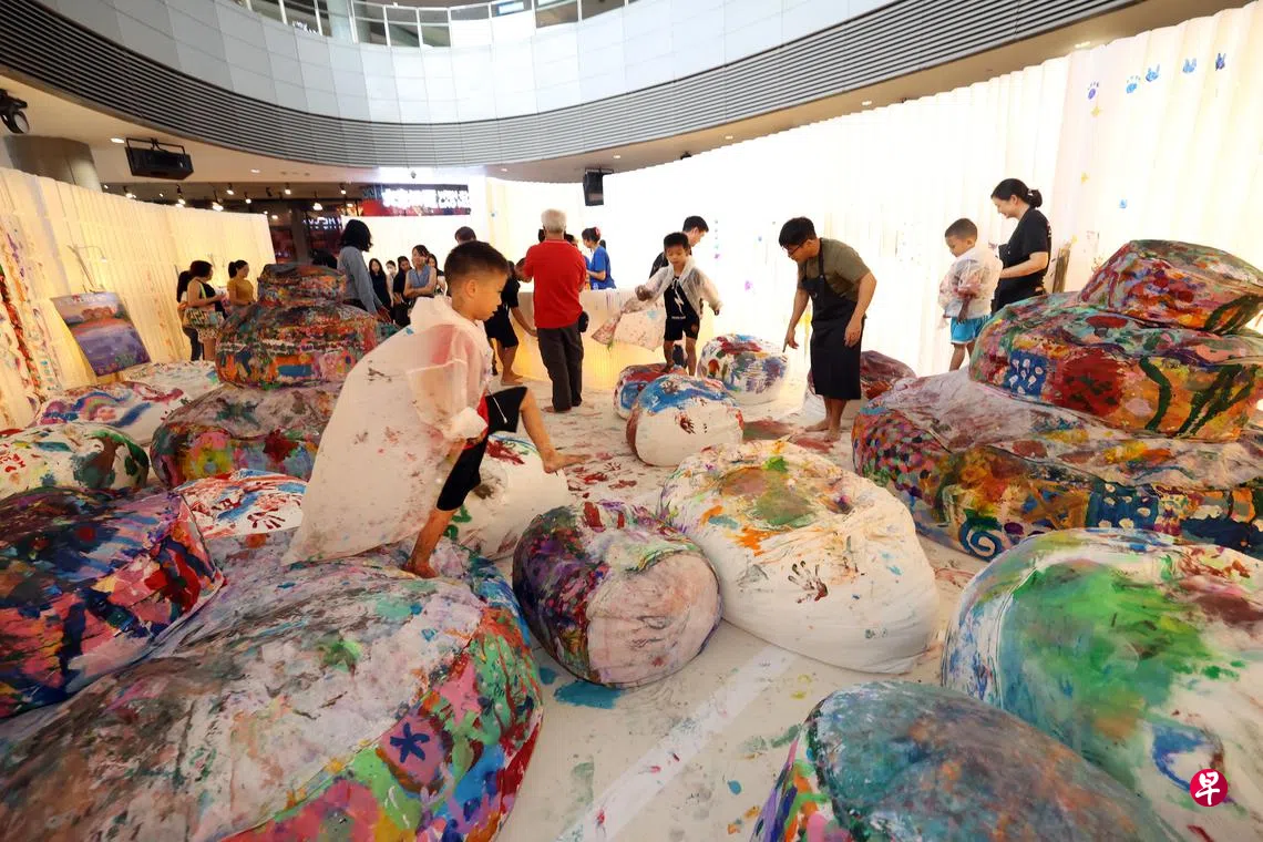星期五上午,在榜鹅水滨坊(Waterway Point)率先登场的是一项亲子艺术活动,吸引不少年轻家庭参与。小朋友们有的在形状各异的帆布沙发之间穿梭跳跃,有的用五彩缤纷的颜料在装置白墙、地板和沙发上随意画画,挥洒活力和创意。