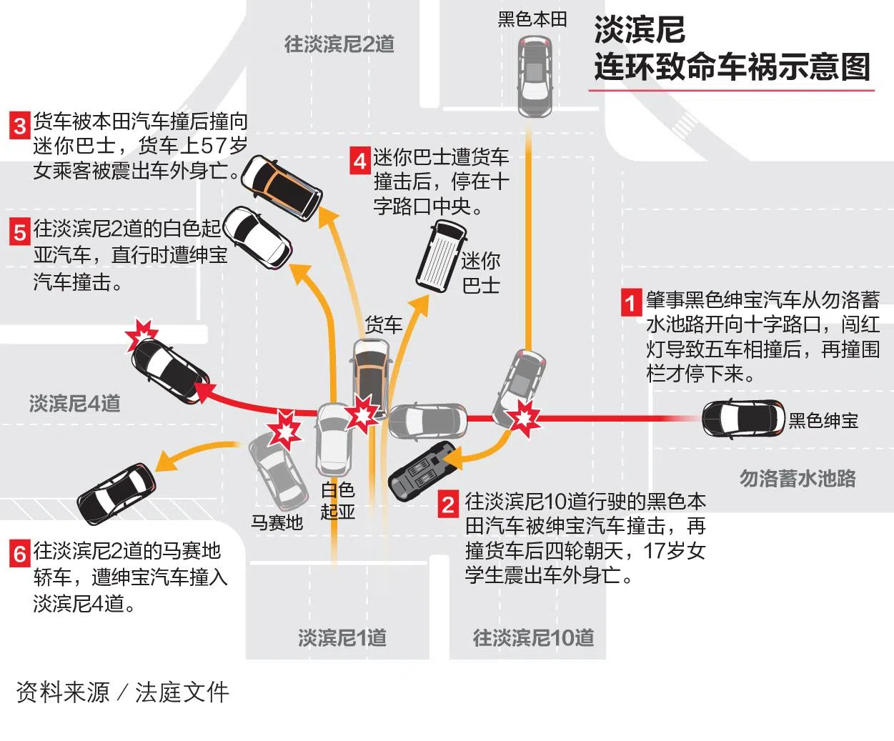不幸丧命的是17岁初院女学生阿菲法,以及事发时乘坐货车的灭虫公司女职员诺兹罕(57岁)。控状显示,车祸的其他伤者包括白色起亚汽车的42岁女驾驶和11岁男童、迷你巴士上的11岁男童、驾驶黑色马赛地的翁海峰(42岁),以及货车司机谢同财(65岁)和乘客阿兹曼(39岁)。