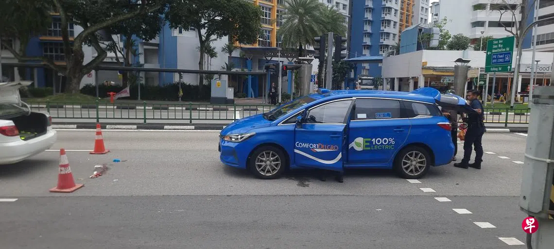 记者走访现场时,涉事康福德高(ComfortDelGro)德士停在交通灯附近,马路上还留下一摊血迹与些许纸巾。据观察,警方在事故现场放置多个三角锥,往来的车辆需绕道而行。