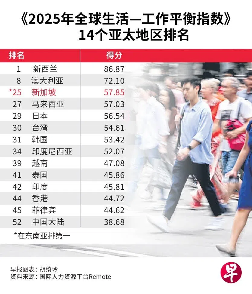 东南亚国家中,新加坡在最新出炉的“生活—工作平衡”指数方面表现最佳,排名第一,马来西亚居次。
