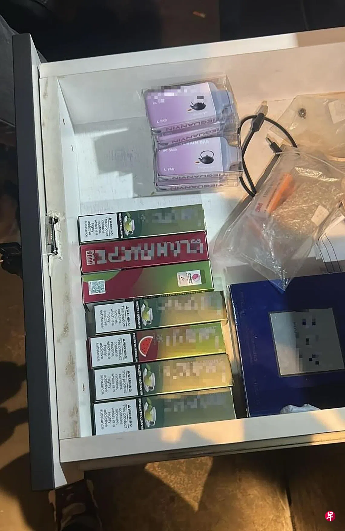 夜总会男经理因售卖电子烟给员工,向执法人员承认罪行后被捕。卫科局随后搜查他的车辆和住所,循迹找到与他有关的非法分销网络。他目前正接受调查。