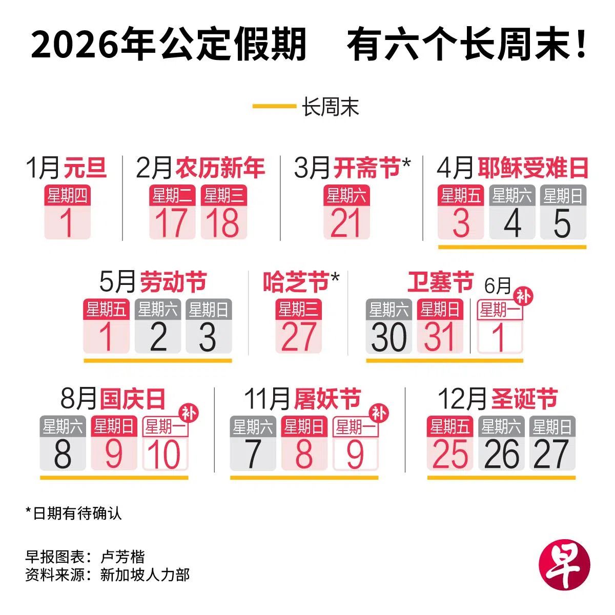 2026年的11个公定假日中,公众将能享有六个长周末,包括耶稣受难日、劳动节、卫塞节和屠妖节。