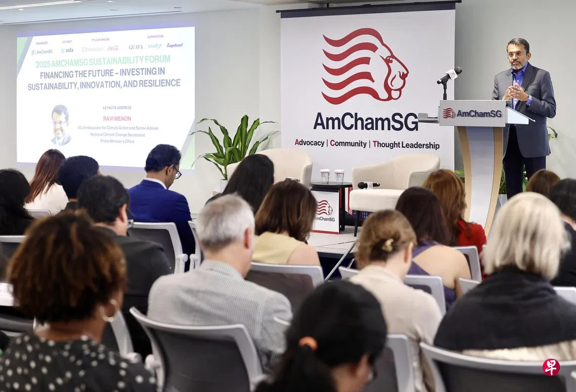 新加坡美国商会(AmChamSG)星期二(6月17日)举办首届可持续发展论坛。主宾孟文能(Ravi Menon)致辞时说,利于气候的营运模式其实利于企业发展,因此企业必须继续推动可持续发展。