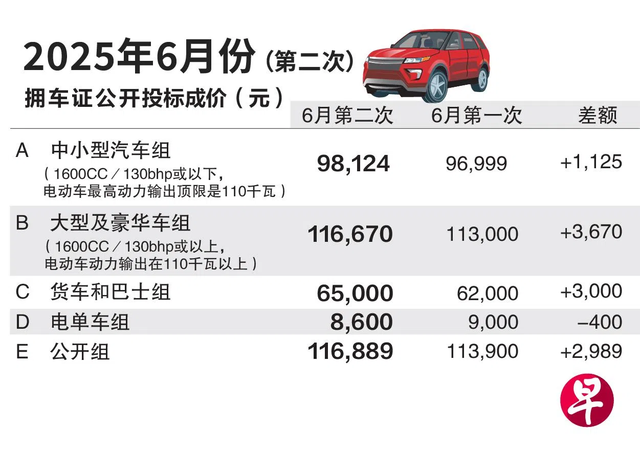 本月第二轮拥车证公开投标活动星期三(6月18日)结束,三大汽车组中,大型及豪华车组(B组)成价升幅最大,上升3670元(3.2%),报11万6670元;其次是一般用于注册B组汽车的公开组(E组),升2989元(2.6%),报11万6889元。