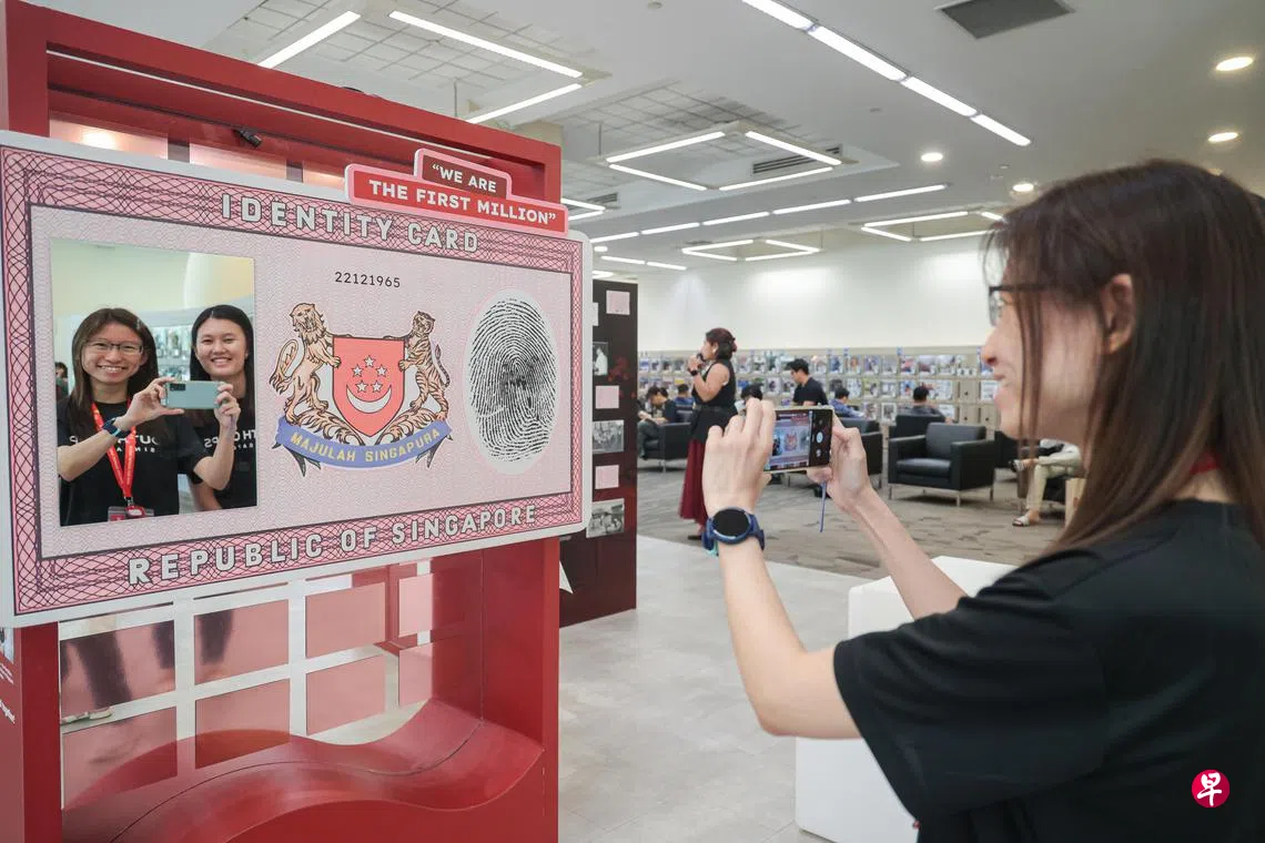 这个邀请公众驻足打卡,充满互动趣味的巨型身份证留影框,是目前在兀兰区域图书馆举办的“我们是新加坡公民——红登记计划”(Project Citizens – The First Million)快闪展览中,最受公众欢迎的展区之一。