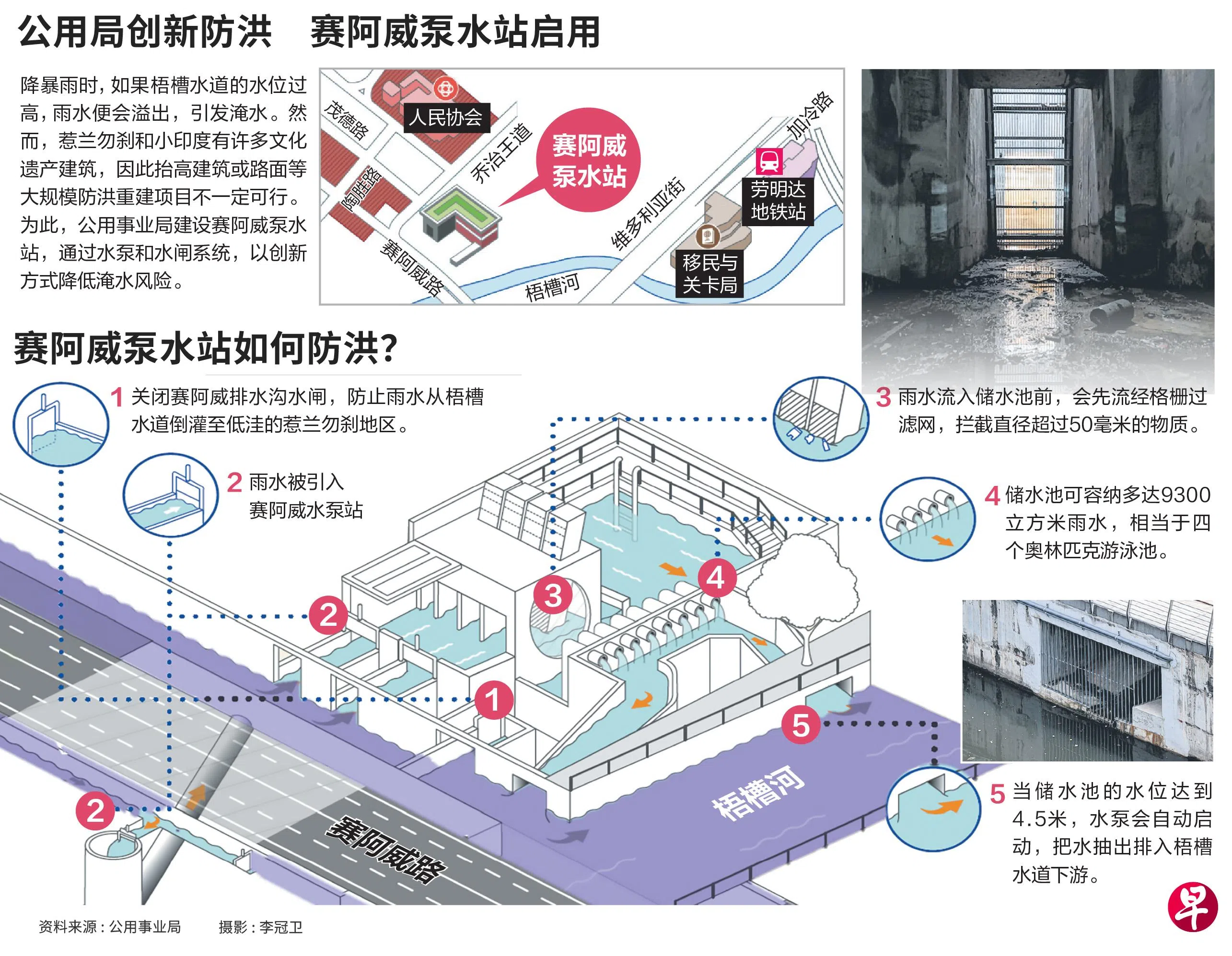 水泵站设有可容纳多达9300立方米雨水的地下储水池,相当于四个奥林匹克游泳池的容量。赛阿威排水沟的水闸处于常闭状态,以防雨水从梧槽水道倒灌进惹兰勿刹。