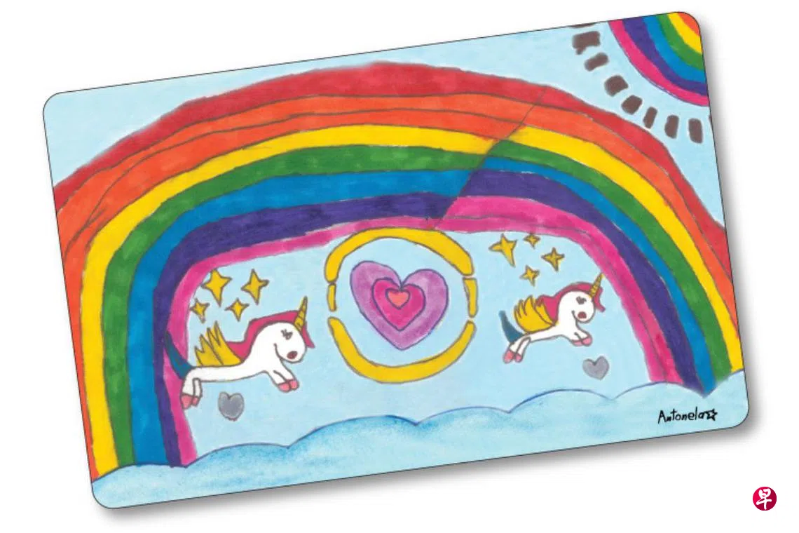 六岁儿童癌症基金会受助女孩创作的“彩虹独角兽”卡,以富童趣的缤纷图案传递希望与正能量,象征对患癌儿童的关怀,也体现对基金会“散发希望”的支持。