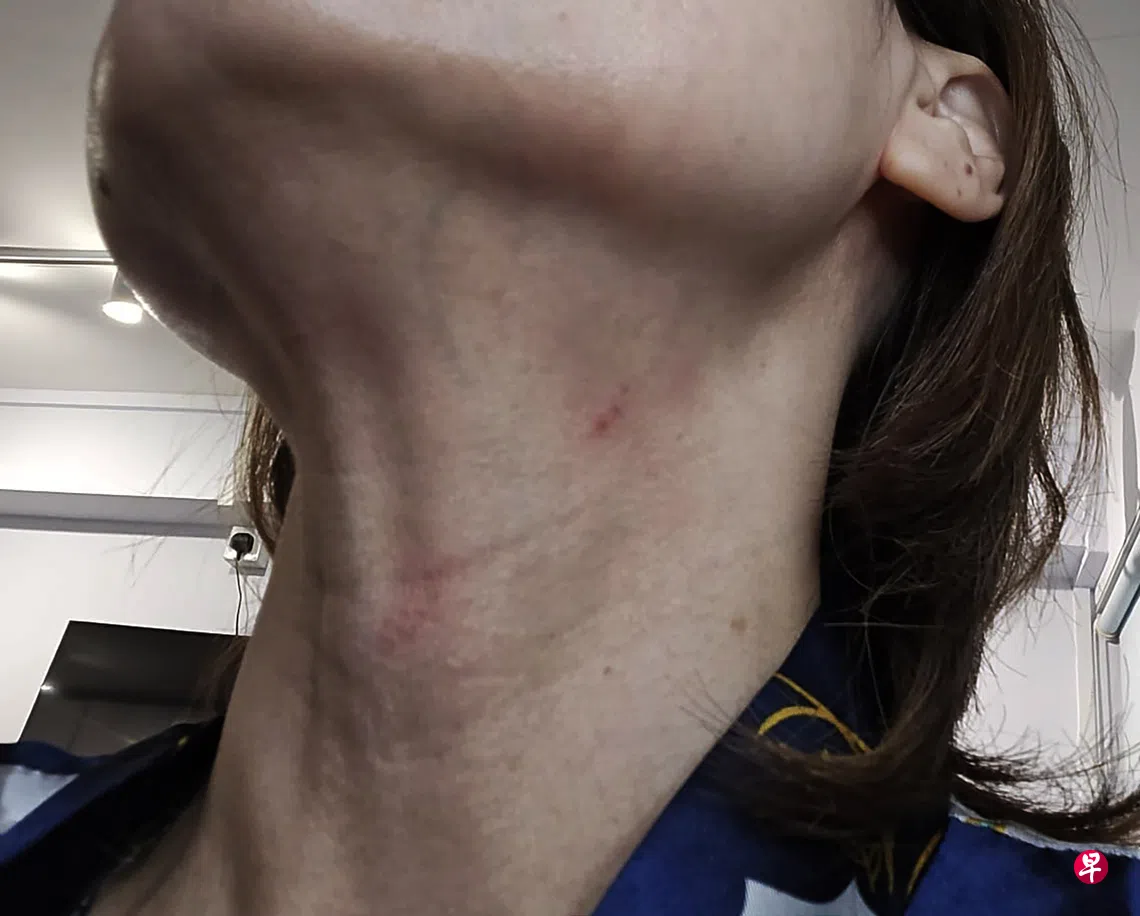 “为了护住儿子,我用尽全身力气抱住他、拉扯着他,却被他袭击。争执期间,他掐我脖子,还抓着我的头去撞墙,我右脚也因此淤青。”