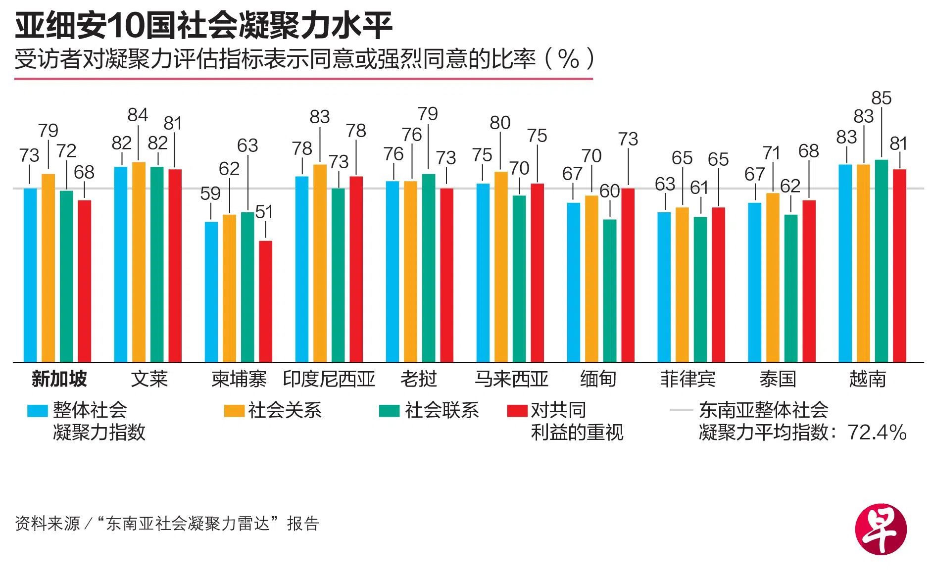 数据显示,东南亚社会整体上呈现高度凝聚力,平均72.4%受访者认为,自己国家的社会凝聚力相当强韧。