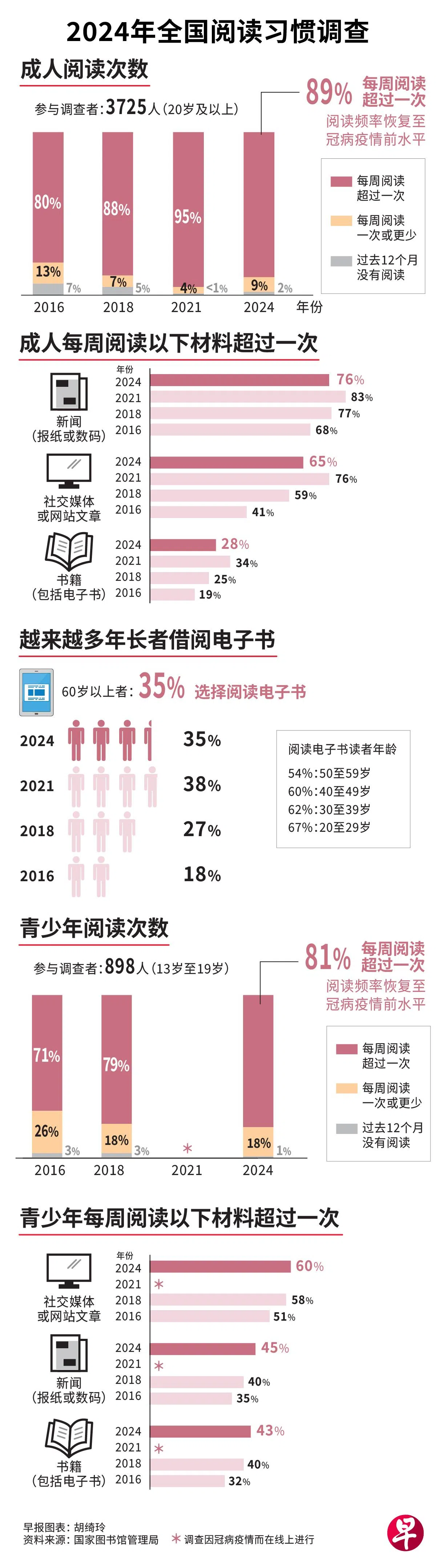 最新出炉的全国阅读习惯调查结果显示,本地居民的整体阅读率依然良好,近89%成人以及81%青少年每周阅读超过一次,恢复至冠病疫情前的水平。数码阅读也成了越来越多人的习惯,借阅电子书的年长者更多了。