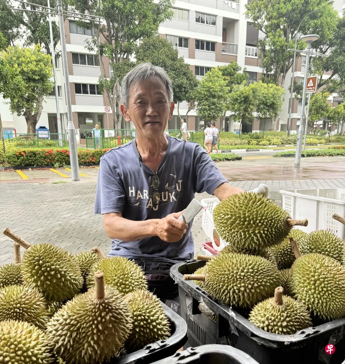 过去近30年来,每逢年中和年尾两三个月的榴梿季节,淡滨尼81街组屋底层商店外,总会飘来一阵阵榴梿的诱人香气,以及六旬榴梿商贩李万隆忙碌的身影。
