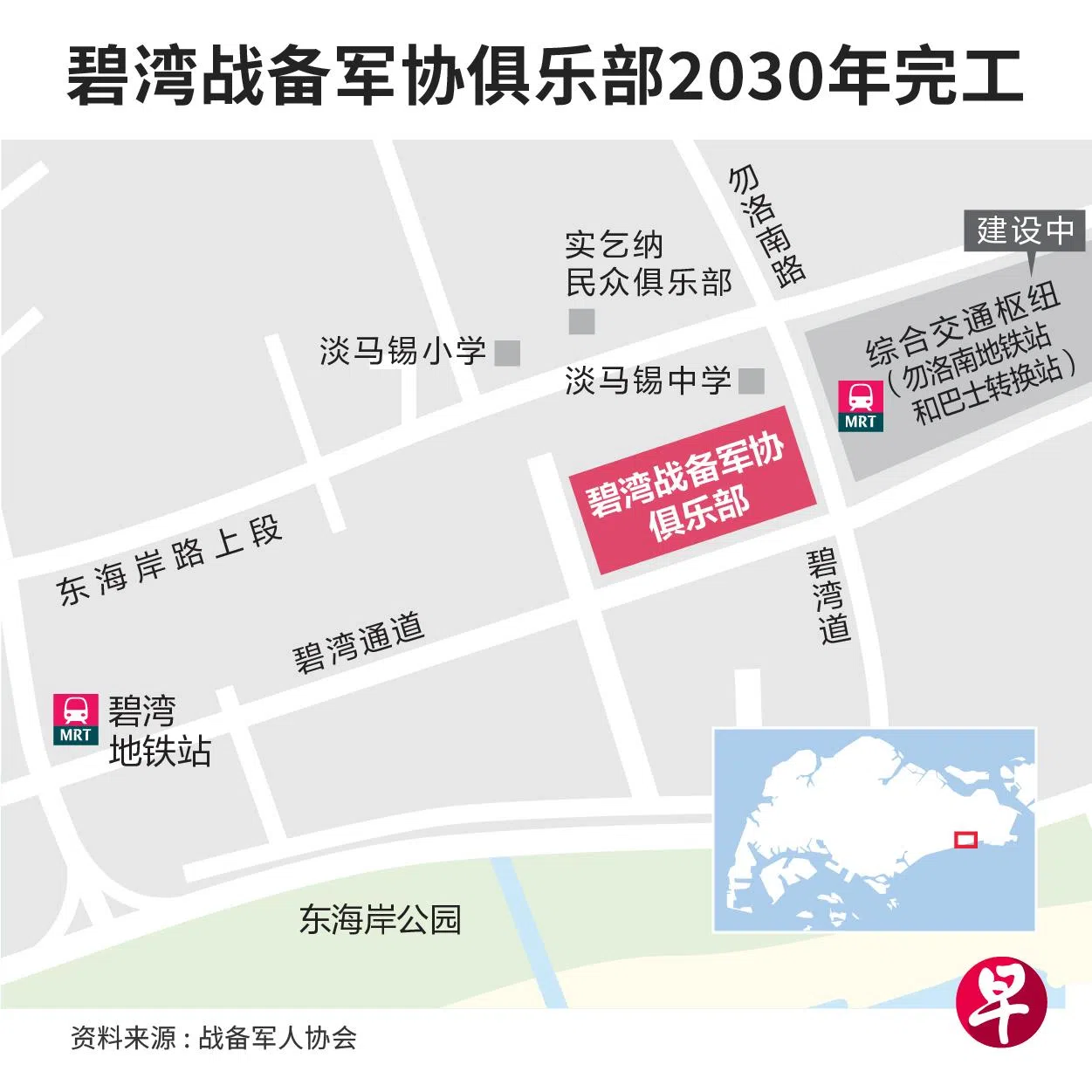 碧湾俱乐部将坐落在汤申—东海岸地铁线勿洛南站与巴士转换站组成的综合交通枢纽旁,毗邻淡马锡中学,总楼面面积达至少3万平方米,是淡滨尼战备军协俱乐部的两倍大。