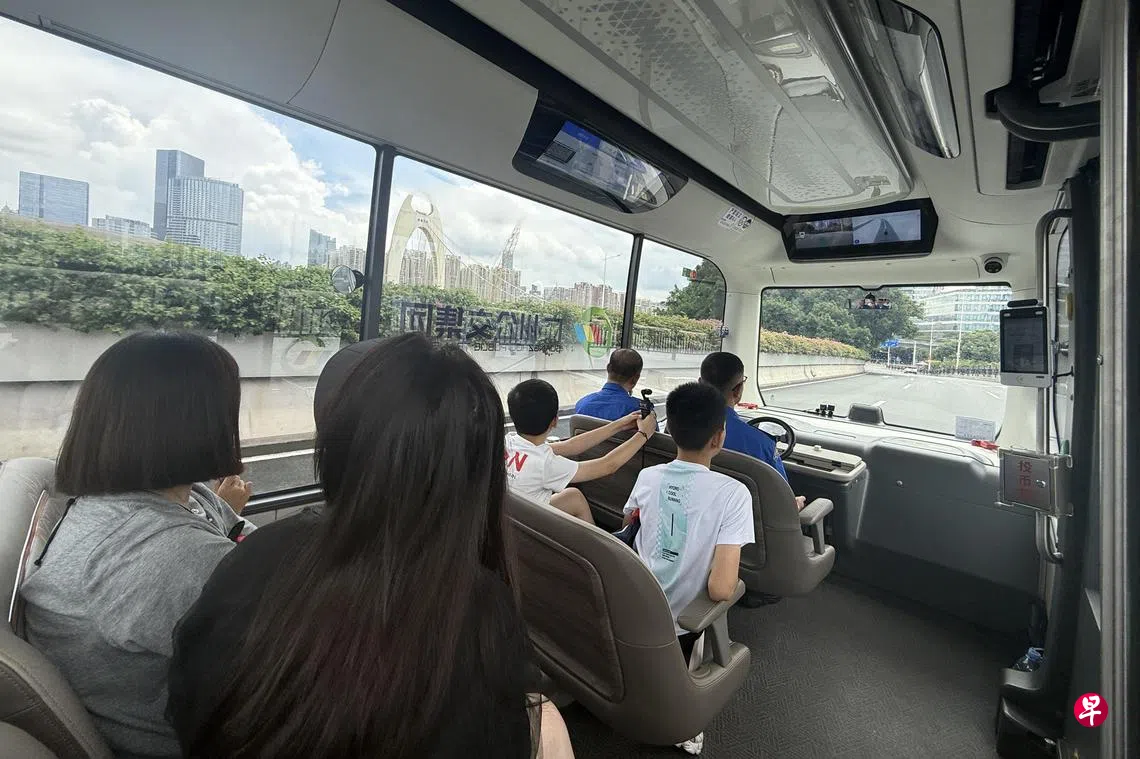 在广州塔地铁站外,乘客用手机刷交通卡、系好安全带,便可搭上色彩鲜艳的自动驾驶小巴,以每小时30多公里的速度沿着珠江前行。小巴行驶平稳,与一般巴士无异。