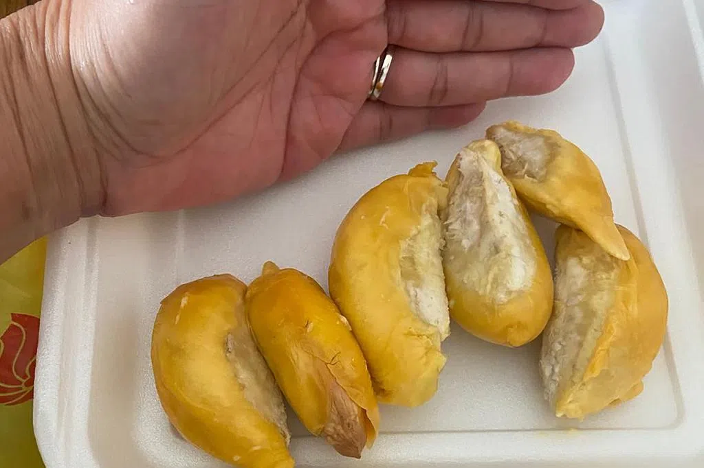 “12元一公斤的是B果的猫山王,我们特地用比较贵的彭亨榴梿做促销。A级的则是20元一公斤,品质更高。上一批榴梿受天气影响问题较多,现在这批,什么品种都好吃。”