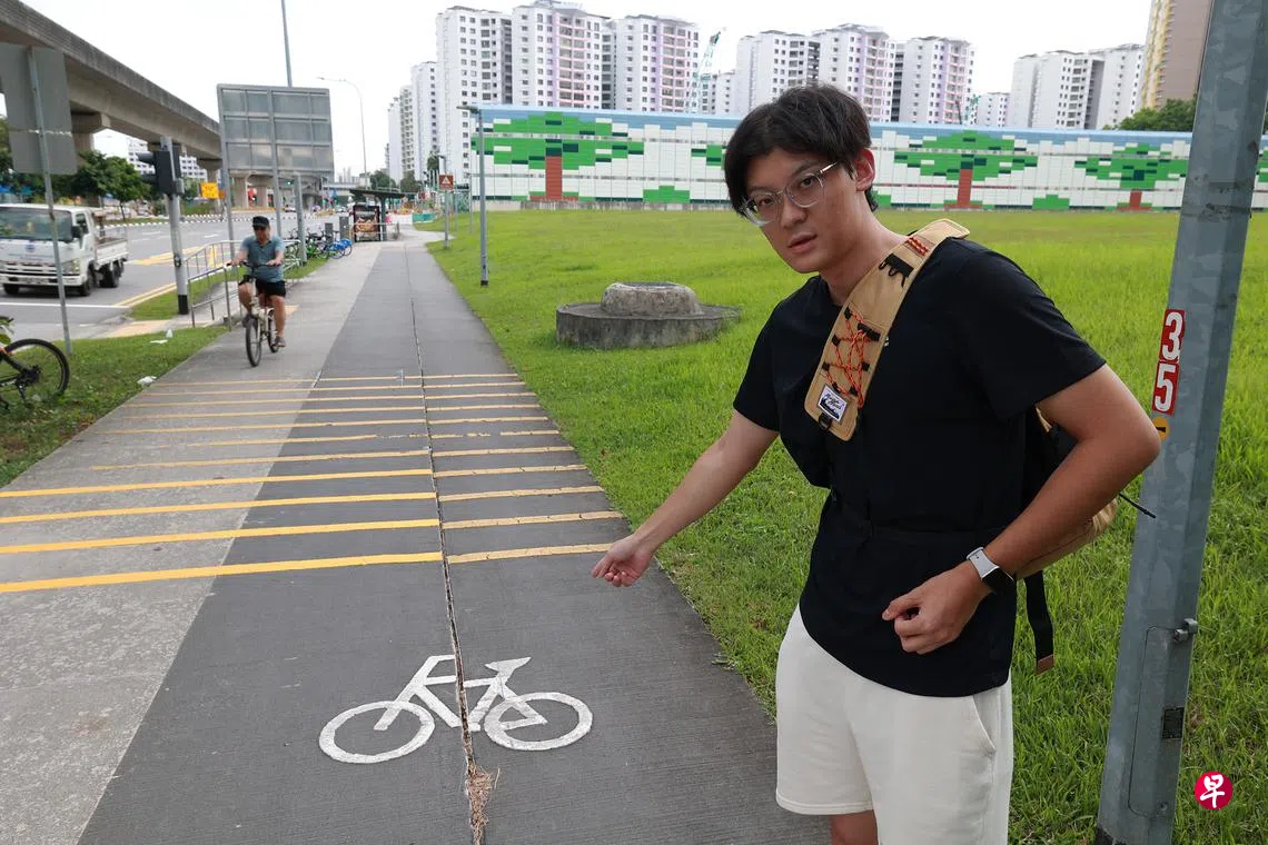即将上大一的杨胤繁(21岁)告诉《新明日报》,6月25日晚上10时24分,他在榜鹅东的脚踏车道上骑行,却因为道路上有缝隙,且不平整,导致他摔倒。