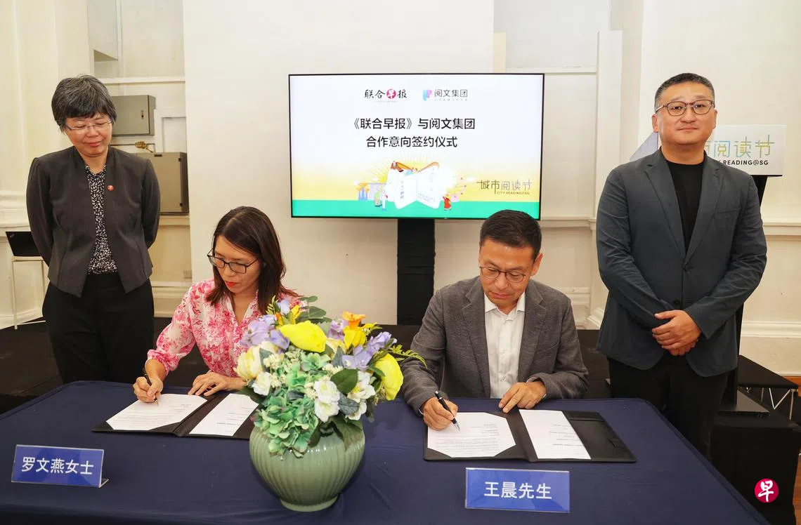 新报业媒体华文媒体集团副社长罗文燕,星期一(6月30日)在旧国会大厦艺术之家(The Arts House)与阅文集团公共事务副总裁王晨签署合作协议,举办全球华文小说创作大赛。